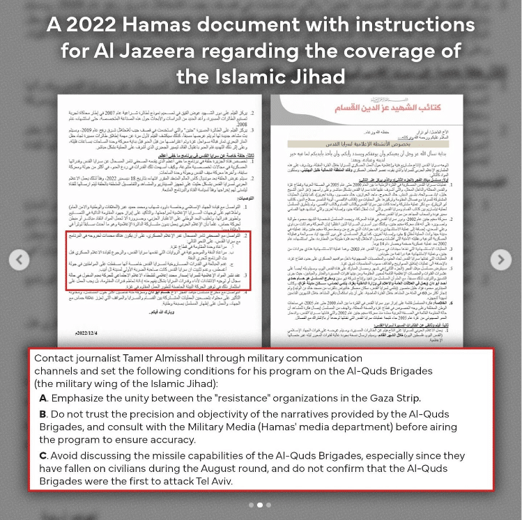 ISRAELI MILITARY PUBLISHES A HAMAS LETTER SENT TO ALJAZEERA. The IDF recently uncovered a Hamas document reportedly sent to the Mideast TV news outlet Al Jazeera, instructing them on wartime reporting guidelines. The document allegedly outlines how to portray events in a manner sympathetic to Hamas’s narrative, sparking debate over media neutrality in conflict zones. The Israeli military views this as evidence of media manipulation tactics by Hamas to sway public opinion [see the original post here and see a sample, below].