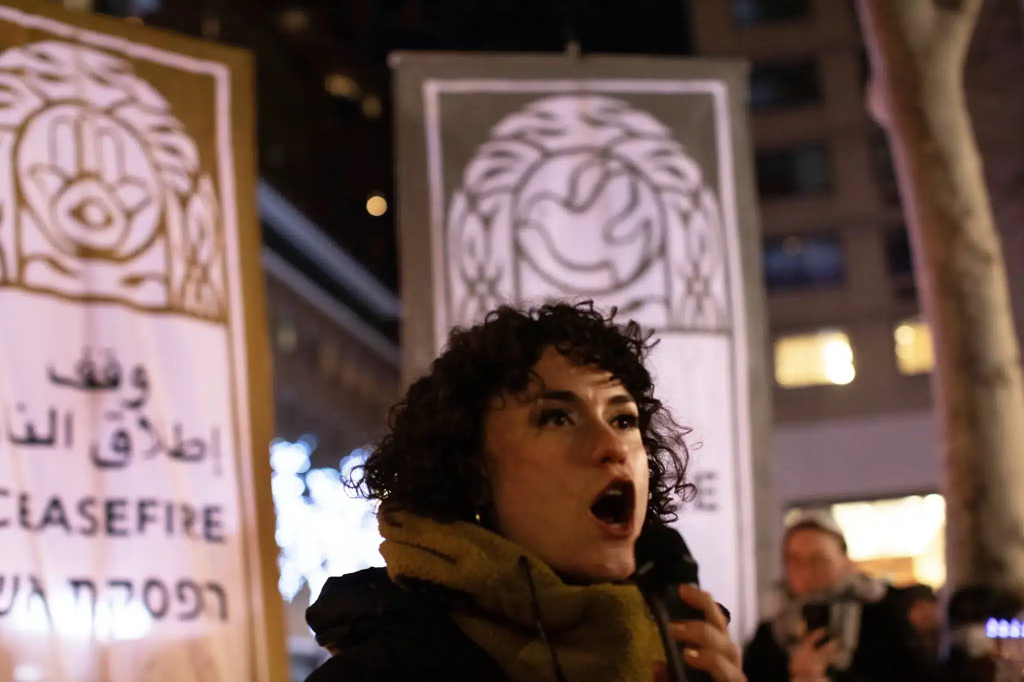 After Borgwardt introduced us, I sat with Carty on a sidewalk, talking over the protesters’ drums. Carty, who is in her mid-30s, learned about the Israeli-Palestinian conflict during college at Brown, partly through a play, “My Name Is Rachel Corrie.” Its plot is based on the story of an American activist who was crushed to death by an Israeli bulldozer in Gaza in 2003 while trying to protect the home of a Palestinian family from being destroyed by the Israeli military. After college, Carty was a facilitator at Occupy Wall Street and then applied organizing methods she had learned to years of work with Momentum, which fosters social-justice groups like Dream Defenders and IfNotNow. She taught IfNotNow ways to sustain attention on issues and build the organization’s membership. She now leads Get Free, a group focused, she said, on “realizing equality by advancing comprehensive reparations,” ranging from compensation to “reckoning with our country’s original sins and the legacy of Black enslavement and Native genocide.”