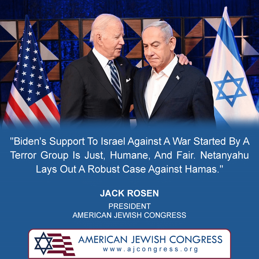 We at the American Jewish Congress thank President Biden for his thoughtful leadership, for being a true friend of Israel, and for his heartfelt remarks that touched the Jewish community at home, Israelis, and people everywhere. He and Prime Minister Netanyahu embody leadership at time of war.