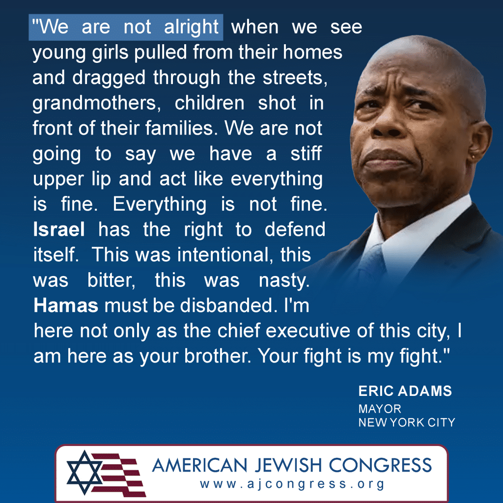 The American Jewish Congress strongly endorses Mayor Adams’ appeal to the world to decisively confront the hate and bloodshed that Hamas has unleashed on Israeli and American citizens and on the people of Gaza who endure a war imposed by this terror group. The world and our partners need to know that Hamas and whoever supports or sympathizes with it – are not just dealing with an angry Israel, but also with an angry America.