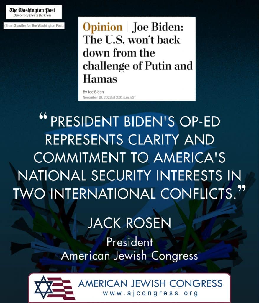 November 24, 2023, New York, NY – President Biden continues his unrelenting support for Israel through the war’s sixth week in a principled stand that defies political pressures and cuts through disinformation. This moral clarity was on display in his Washington Post op-ed over the weekend where he rejected a ceasefire and convincingly argued in favor of breaking the cycle of violence by eliminating its cause, and rallied the nation behind his emergency funding request for Israel and Ukraine.