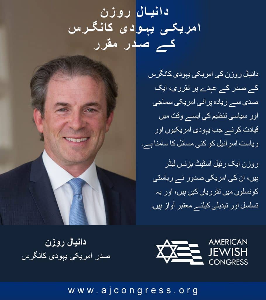 نیو یارک – امریکی یہودی کانگرس کے بورڈ آف ڈائریکٹرز نے دانیال روزن تنظیم کے صدر کے منصب کیلئے نامزد کیا ہے۔ یہ نیویارک میں قائم ایک غیر سرکاری تنظیم ہے جس کی بنیاد 100 سال سے زیادہ عرصہ قبل ممتاز سائنسدان البرٹ آئنشٹائن اور امریکی سپریم کورٹ کے دو جسٹس فیلکس فرینکفرٹر اور لوئس برینڈیز نے رکھی۔ نئے صدر دانیال روزن ایک رئیل اسٹیٹ بزنس مین ہیں اور امریکی صدور کی طرف سے سرکاری عہدوں پر فائز رہے ہیں۔ روزن کی تقرری یہودی امریکیوں اور ریاست اسرائیل کی سلامتی کیلئے ایک نازک وقت پر ہوئی ہے، کیونکہ امریکہ میں یہود دشمنی معاشرے اور کالج کیمپس دونوں میں تشویسناک سطح پر پہنچ گئی ہے۔