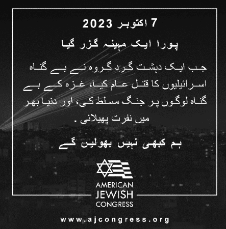 ہم اسرائیل کے ساتھ، حماس سے آزادی کے خواہاں غزہ کے بے گناہ شہریوں کے ساتھ، اور حماس کے قید خانوں میں آج قید اسرائیلی یرغمالیوں کے خاندانوں کے ساتھ یکجہتی کا اظہار کرتے ہیں۔